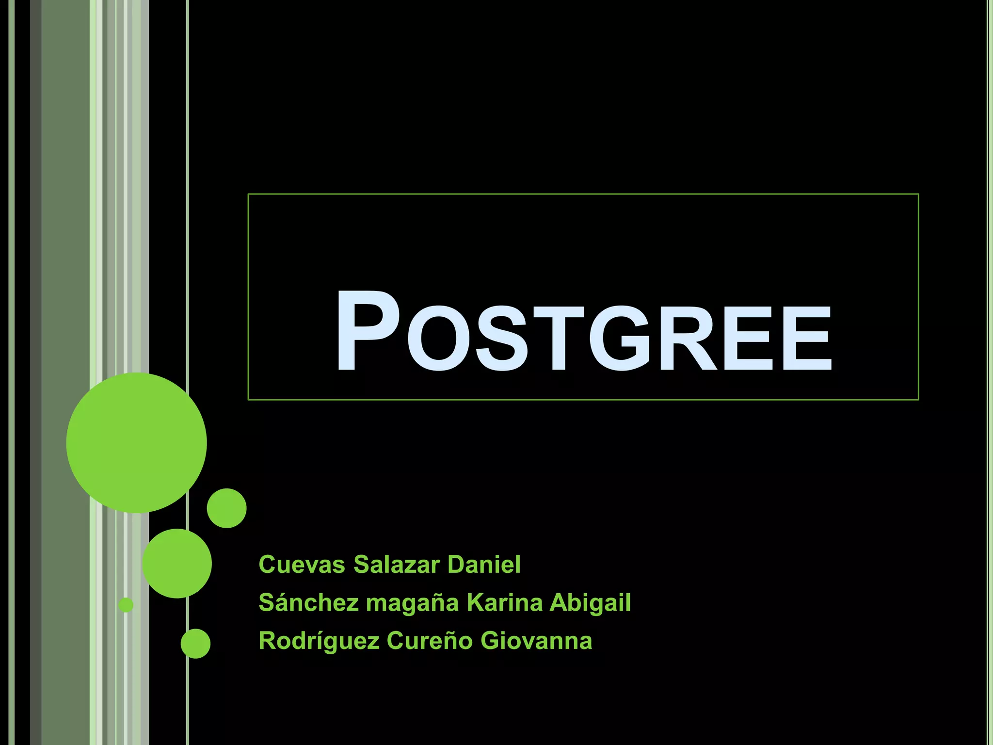 PostgreSQL es un sistema de gestión de bases de datos relacional y orientado a objetos, desarrollado por una comunidad de colaboradores bajo la licencia BSD. Desde su creación en 1982 y su primera versión en 1996, ha evolucionado con características como alta concurrencia y soporte para múltiples tipos de datos. Es utilizado ampliamente por grandes organizaciones y desarrolladores comerciales por su flexibilidad y potencia.