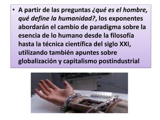 El documento aborda el posthumanismo y la inteligencia artificial, discutiendo cómo estos conceptos desafían la definición de la humanidad en el contexto de la filosofía, la técnica, y la globalización. Se exploran temas como el transhumanismo, la creación de cyborgs, y las implicaciones éticas y sociales de la tecnología en la vida y la muerte. Además, se presentan ejemplos de avances en bioingeniería y la relación entre humanos y máquinas, cuestionando las fronteras entre lo orgánico y lo artificial.