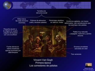 Este documento resume la evolución artística de Vincent Van Gogh a través de sus obras más representativas, describiendo las características técnicas y temáticas de cada una. Comienza con sus primeras obras realistas como "Los comedores de patatas" y continúa analizando cómo su estilo fue volviéndose más expresionista e impresionista a través de cuadros como "La llanura de Crau", para culminar con obras completamente abstractas y coloristas realizadas antes de su muerte, como "Campo de trigo con c