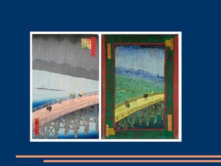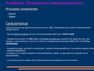 El documento resume los principales movimientos y artistas del postimpresionismo, incluyendo el puntillismo de Seurat, el expresionismo de Van Gogh, el primitivismo de Gauguin, las representaciones de la vida nocturna parisina de Toulouse-Lautrec, y el análisis constructivo de las formas de Cézanne. Cubre el periodo entre 1886 y principios del siglo XX.