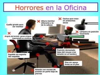 Este documento proporciona consejos sobre cómo adoptar una postura saludable al trabajar con una computadora, incluyendo mantener la espalda recta, los ojos al nivel del monitor, y los pies apoyados en el suelo. También recomienda realizar ejercicios breves cada hora para relajar la espalda, cuello, hombros y manos.