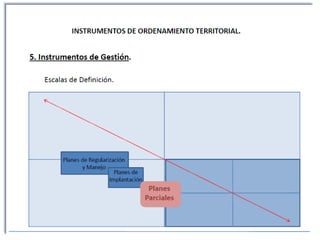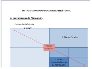 Este documento proporciona una introducción al ordenamiento territorial y la gobernanza del agua en la cuenca del Río Tunjuelo en Bogotá, Colombia. Explica brevemente conceptos clave como ordenamiento territorial, componentes del Plan de Ordenamiento Territorial de Bogotá como la estructura ecológica, funcional y socioeconómica, y normas y clasificaciones de suelo urbano. También incluye una sección sobre la cartografía del POT de 2010.