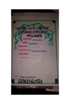 Este portafolio estudiantil contiene información sobre Veronica Yunga, una estudiante del primer curso de la sección nocturna en la Unidad Educativa Octavio Cordero Palacios durante el año lectivo 2020-2021. El portafolio incluye detalles sobre la asignatura de Filosofía y su maestro Wilfredo Chumbay.