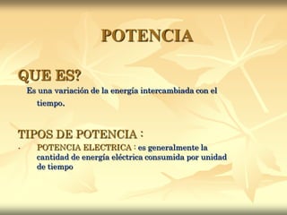 La potencia es una medida de la energía intercambiada con el tiempo y se mide en vatios. Existen diferentes tipos de potencia como la potencia eléctrica, activa, aparente y reactiva. La potencia se puede medir utilizando instrumentos como el voltímetro, el contador de potencia y el medidor de potencia.
