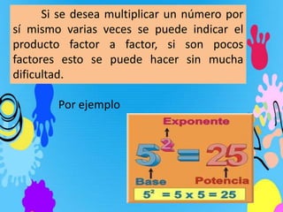 El documento explica las propiedades básicas de las potencias. Define una potencia como un producto de factores iguales, donde la base es el número que se multiplica y el exponente indica cuántas veces se multiplica la base. Luego detalla propiedades como que una potencia de 0 es 1, una potencia de 1 es el número mismo, y al dividir o multiplicar potencias con la misma base simplemente se suma o resta los exponentes.