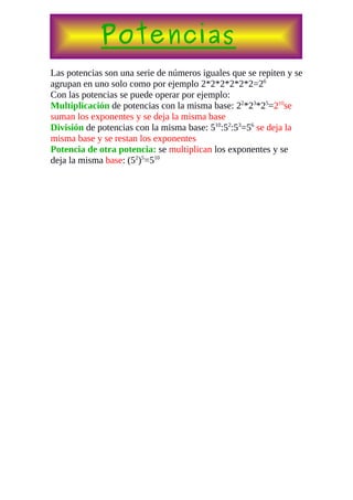 Las potencias son números que se repiten y se agrupan, como 2^6=64. Se puede operar con potencias mediante la suma o resta de exponentes cuando se multiplica o divide potencias con la misma base, o la multiplicación de exponentes cuando una potencia se eleva a otra potencia.