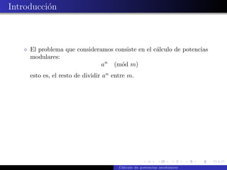 Este documento describe un algoritmo para calcular potencias modulares de forma eficiente. El algoritmo involucra descomponer el exponente en suma de potencias de 2, calcular potencias modulares individuales elevando al cuadrado y reduciendo, y multiplicar las potencias para obtener el resultado final. El documento también discute cómo implementar este algoritmo en una hoja de cálculo usando sucesiones por recurrencia.