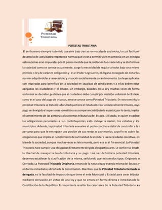 La potestad tributaria se refiere a la facultad que tiene el Estado de crear tributos de forma unilateral y obligar a las personas a pagarlos. Existen dos tipos de potestad tributaria: originaria, que emana directamente de la constitución, y derivada, que es delegada a entidades como municipios. La potestad tributaria del Estado está limitada por principios constitucionales como la legalidad, capacidad contributiva e igualdad. Los municipios también tienen una potestad tributaria derivada para crear y recaudar tributos locales, aunque con límites establecidos en