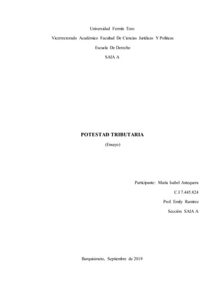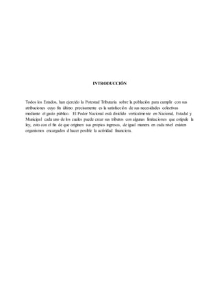El documento discute la potestad tributaria del Estado. Define la potestad tributaria como la facultad que tiene el Estado de crear tributos unilateralmente. Explica que la potestad tributaria emana de la soberanía del Estado y se manifiesta a través de la creación de normas tributarias. También distingue entre la potestad tributaria originaria, otorgada directamente por la constitución, y la derivada, otorgada por leyes. Finalmente, señala algunos principios como la legalidad y la capacidad contributiva que limitan el ejercicio de la pot