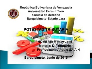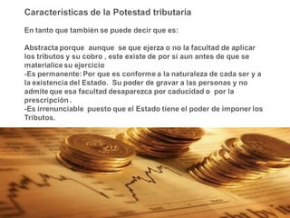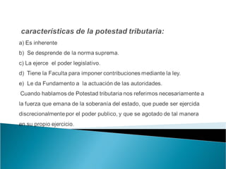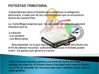 Este documento trata sobre la potestad tributaria del Estado. El Estado tiene la facultad de crear tributos con el fin de recaudar recursos para cubrir el gasto público. La potestad tributaria es la facultad del Estado de exigir el pago de tributos de acuerdo a su poder. Esta potestad puede ser originaria, establecida en la constitución para cada entidad territorial del Estado como la nación, estados y municipios, o puede ser derivada de normas subordinadas a leyes orgánicas y ordinarias para entes menores.