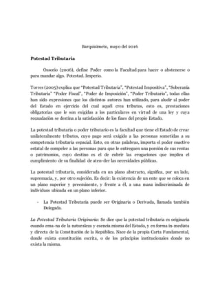El documento describe la potestad tributaria del Estado. Define la potestad tributaria como la facultad del Estado para crear tributos de manera unilateral y exigir su pago a las personas sujetas a su jurisdicción tributaria. Explica que la potestad tributaria puede ser originaria o derivada, y describe las características de la potestad tributaria como abstracta, permanente, irrenunciable e indelegable. Además, identifica las limitaciones constitucionales a la potestad tributaria y describe las potestades tributarias nacionales, estadales y municipales según