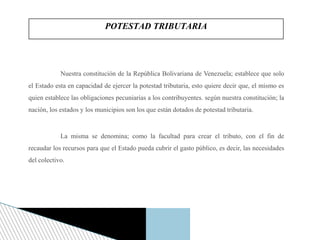 1) La potestad tributaria corresponde al Estado para crear tributos con el fin de recaudar recursos y cubrir el gasto público. 2) La potestad tributaria es originaria del Estado nacional, estadal y municipal de acuerdo con la Constitución venezolana. 3) Existen diferentes formas de determinar la obligación tributaria municipal, como la determinación por el sujeto pasivo, mixta u de oficio.