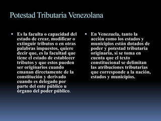 El documento describe la potestad tributaria en Venezuela. Explica que la potestad tributaria es la facultad del estado para crear, modificar o extinguir impuestos. Esta puede ser originaria, directamente establecida en la constitución, o derivada, delegada a entes públicos por ley. La potestad tributaria se clasifica como originaria o derivada y se limita por principios como generalidad y legalidad. Además, detalla las competencias tributarias de la nación, estados, municipios y sus respectivos ingresos.