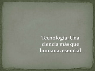 La tecnología es esencial para el ser humano y nos permite evolucionar. Dispositivos como celulares, computadoras y automóviles forman parte integral de la vida moderna. Sin embargo, también enfrentamos desafíos como el cambio climático, por lo que se necesita tecnología amigable con el medio ambiente. La web es una herramienta fundamental que simplifica la vida de las personas y las conecta a nivel global. La tecnología del siglo 21 debe promover un pensamiento innovador que genere riqueza de manera sustentable.