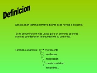 El documento habla sobre el microrrelato como una forma literaria breve distinta del cuento o la novela. Explica que proviene de tradiciones antiguas como los bestiarios medievales o las parábolas de Jesús. Autores como Julio Cortázar popularizaron el género en el siglo XX. Aunque breves, los microrrelatos pueden abarcar diversas temáticas y cruzar géneros literarios. El autor Juan José Millás es destacado por su maestría en este estilo.