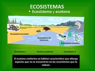 El documento habla sobre los ecosistemas y ecotonos. Explica que un ecotono es un hábitat de transición entre dos ecosistemas que alberga especies únicas. Los ecosistemas forman parte de biomas mayores y todos juntos componen la biosfera. Plantea preguntas sobre cuánto podemos afectar un ecosistema sin afectar la biosfera y en qué medida se pueden alterar parámetros globales antes de afectar a todos los ecosistemas de la Tierra.