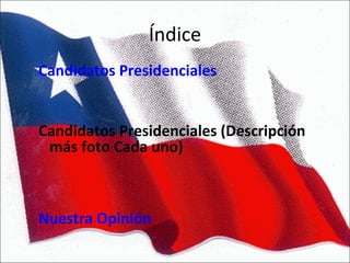 El documento presenta una lista de candidatos presidenciales para las elecciones en Chile y ofrece una opinión sobre quién debería ganar. Menciona a cuatro candidatos presidenciales y sugiere que el ganador debería ser el más apto para el cargo y capaz de tomar decisiones que sean aceptadas por todos para evitar conflictos como en gobiernos anteriores.
