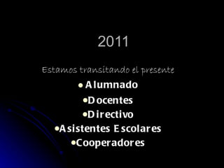 Este documento presenta la composición de la escuela en el año 2011, incluyendo los niveles educativos de primaria desde inicial hasta séptimo grado, los docentes de tecnología y música, el personal directivo, las asistentes escolares como las cocineras y el portero, y agradece el trabajo de la comisión cooperadora y el club de madres.