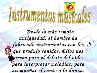 Los instrumentos musicales se clasifican en tres grupos principales: instrumentos de cuerda, instrumentos de percusión y instrumentos de viento. Dentro de cada grupo hay una variedad de instrumentos como violines, guitarras, tambores, flautas y trompetas. Recientemente han surgido nuevos instrumentos electrónicos que amplían las posibilidades musicales. Tanto la música como la expresión corporal son formas de arte que desarrollan la sensibilidad y creatividad humanas y permiten la comunicación.