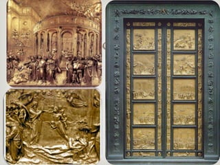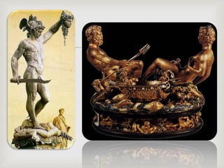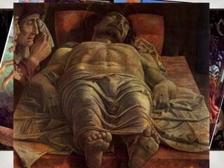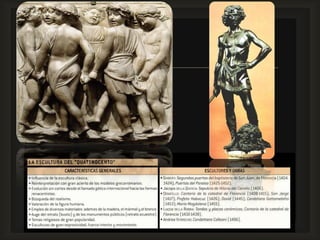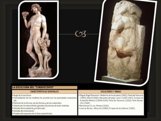 Este documento habla sobre la historia del arte moderno en Italia, mencionando movimientos como el Renacimiento, Manierismo, y Barroco. Se destacan artistas clave de cada período como Miguel Ángel, Rafael, Parmigianino, y Tiziano. También describe características de estilos como el uso de colores extraños en el Manierismo y el dinamismo en la pintura Barroca.