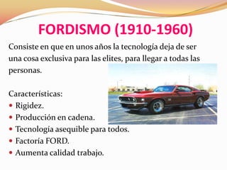 El documento resume tres etapas de la tecnología de la información y la comunicación: el fordismo (1910-1960) cuando la tecnología se hizo accesible para todas las personas, el postfordismo (1960-1990) cuando se empezó a valorar las ideas de la minoría para mejorar la producción, y la sociedad del conocimiento (1990-presente) caracterizada por un libre acceso a la información que ha llevado a una mayor individualización.