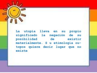 La utopía educativa busca ofrecer una perspectiva atrayente y satisfacción profunda que la sociedad posmoderna no provee. La utopía surge de la crítica a la realidad y postula una actitud no conformista que rechaza la injusticia y la miseria. Aunque las utopías educativas pueden parecer quiméricas, son la única esperanza para reorientar la historia hacia fines más nobles.
