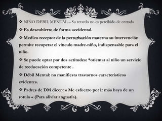 Este documento trata sobre la insuficiencia mental y los débiles mentales. Describe que los débiles mentales a menudo no muestran signos evidentes de discapacidad y que su éxito escolar y social depende de su historia particular. También explica que la gravedad de los trastornos psicomotores depende de la relación con la madre y que la inteligencia no es solo un factor cuantitativo sino también cualitativo. Finalmente, enfatiza la importancia de estudiar no solo al individuo débil mental sino también a su familia.