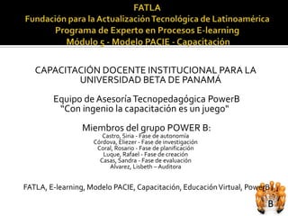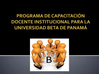 El documento presenta un programa de capacitación virtual para docentes de la Universidad Beta de Panamá utilizando plataformas como Moodle. El equipo Power B diseñó el programa con el objetivo de mejorar las habilidades docentes en TIC. El programa incluye análisis de necesidades, diseño de cursos, y evaluación. Se implementará en los tres núcleos de la universidad para capacitar a los docentes en el uso pedagógico de las TIC.