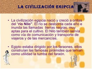 La civilización egipcia floreció a lo largo del río Nilo, que inundaba las tierras cada año haciéndolas fértiles para la agricultura. Egipto estaba gobernado por los faraones, quienes eran considerados dioses y construyeron las famosas pirámides como tumbas. Los egipcios organizaban su sociedad de forma jerárquica y creían en varios dioses representados como animales u hombres que garantizaban el orden del universo.