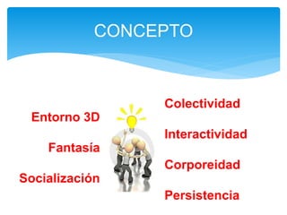Este documento describe los mundos virtuales, definidos como entornos 3D persistentes e interactivos donde los usuarios interactúan a través de avatares. Explora los conceptos clave, características, ventajas y desventajas de los mundos virtuales, incluyendo la socialización, la innovación y el entrenamiento que brindan, así como los altos costos y riesgos de escapismo que conllevan.
