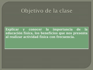 El documento presenta una clase de educación física para estudiantes de 6° básico. La clase tiene como objetivo explicar la importancia de la educación física y los beneficios de realizar actividad física con frecuencia. La educación física ayuda al desarrollo integral de las personas a través del movimiento y la participación en actividades motrices. También promueve la salud, la tolerancia y el respeto.