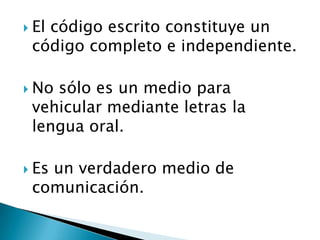 El documento describe el código escrito como un código completo e independiente que requiere aprender reglas diferentes al código oral. Explica las diferencias entre la comunicación oral y escrita en términos de canal, receptor, tipo de comunicación y contexto. También resume las opiniones de varios autores sobre la relación entre lo oral y escrito y cómo ha evolucionado a lo largo de la historia.