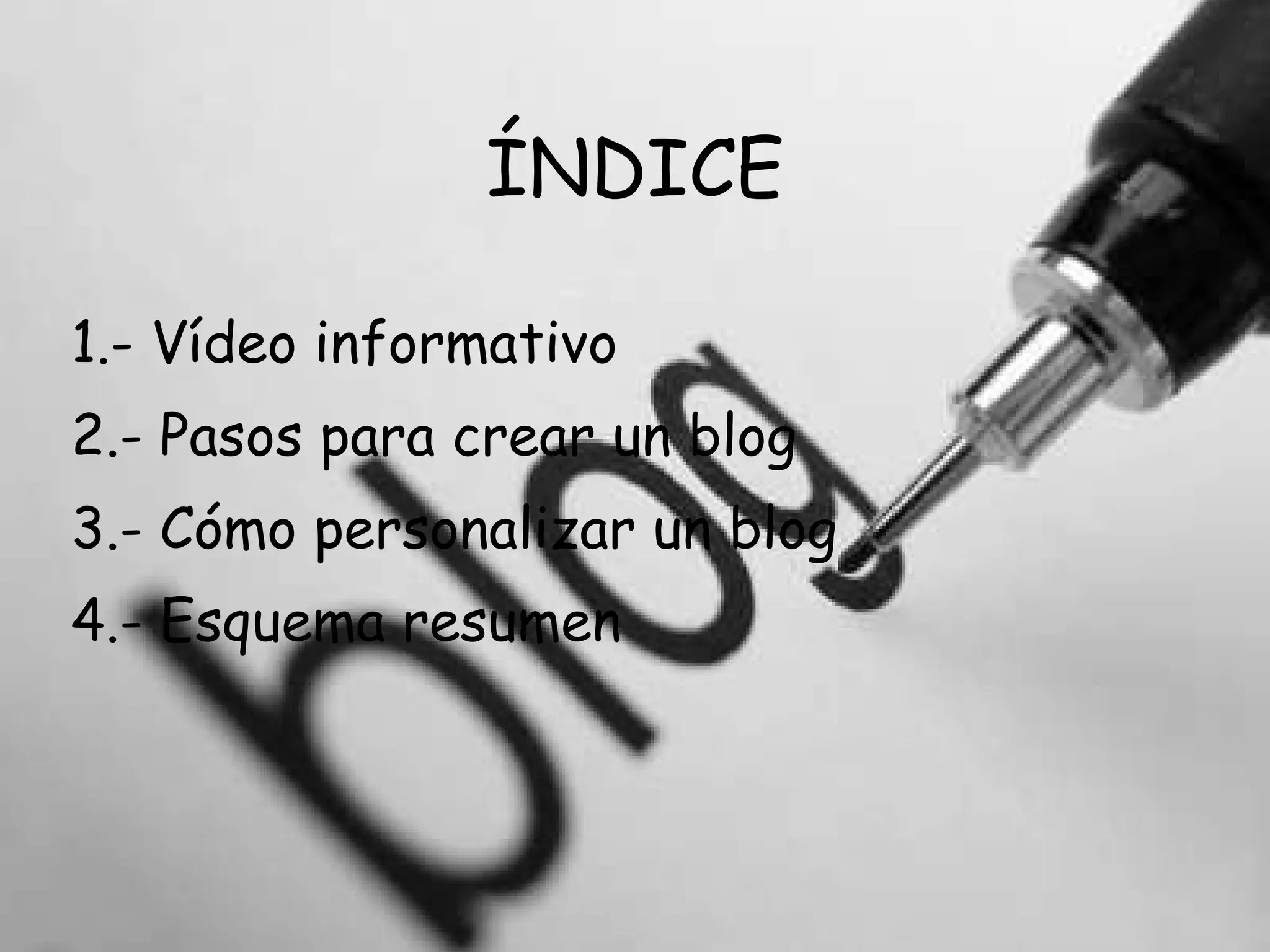 Este documento proporciona instrucciones para crear un blog en 4 pasos: 1) crear una cuenta de Gmail, 2) registrarse en Blogger usando la cuenta de Gmail, 3) personalizar el blog eligiendo una plantilla y presentando el tema, y 4) agregar contenido y gadgets para completar el blog.