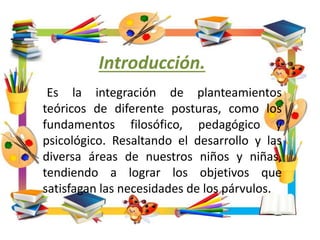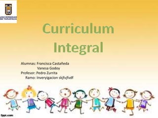 El documento describe los fundamentos de un currículo integral, incluyendo aspectos filosóficos, pedagógicos y psicológicos. Se enfoca en el desarrollo integral de los niños considerándolos sujetos activos. Un currículo integral es flexible y promueve la investigación, el trabajo en equipo y los proyectos relacionados con los intereses de los estudiantes. Su objetivo final es lograr un aprendizaje óptimo que satisfaga las necesidades de los niños de manera holística.