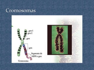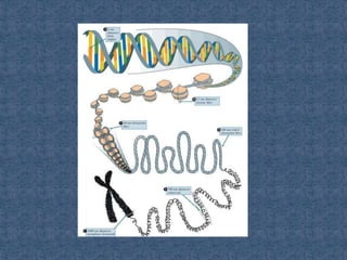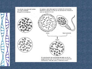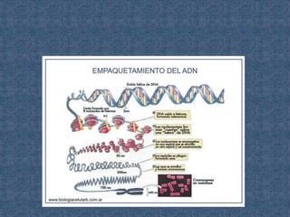 El documento resume la organización del material genético en las células. Explica que el ADN se encuentra en el núcleo y contiene la información genética organizada en cromosomas. Los cromosomas están formados por ADN y proteínas como las histonas. El documento también describe la estructura del ADN, la división celular y la transferencia de material genético entre generaciones a través de los gametos.