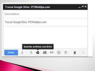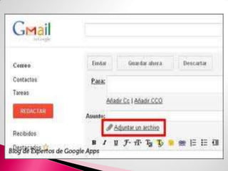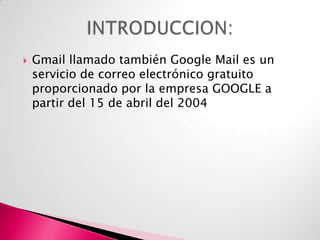 Gmail es un servicio de correo electrónico gratuito lanzado por Google en 2004 que ofrece gran capacidad de almacenamiento en la nube. Gmail integra otras aplicaciones de Google como Drive, YouTube y Google Docs. El servicio incluye funciones como filtros anti-spam, etiquetado de mensajes y chat integrado.