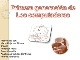 La primera generación de computadoras utilizaba tubos de vacío que desprendían mucho calor y tenían una vida corta. Eran máquinas grandes y pesadas como el ENIAC de 30 toneladas que almacenaba información en un tambor magnético interior. Se programaban en lenguaje máquina con cadenas de bits, por lo que la programación era larga y costosa. Utilizaban tarjetas perforadas para los datos y programas.