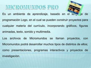 El documento describe un ambiente de aprendizaje que utiliza el lenguaje de programación Logo para crear proyectos educativos en diversas materias. Se pueden desarrollar presentaciones, programas interactivos y proyectos de investigación, que incorporan gráficos, animaciones, texto, sonido y multimedia. Los archivos generados se denominan proyectos de micromundos.