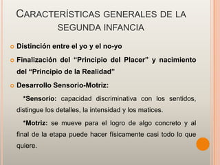 Este documento describe las características clave de la segunda infancia desde los 3 a 6 años. En esta etapa, los niños desarrollan su identidad, inteligencia y habilidades sociales a través del juego, la imitación y la interacción con otros. También comienzan a comprender las diferencias entre los sexos y a resolver el complejo de Edipo, lo que es fundamental para su desarrollo psicosocial y de la identidad sexual.