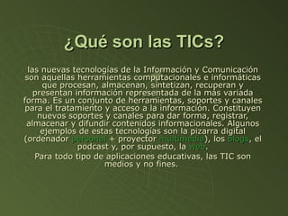 Las Tecnologías de la Información y la Comunicación (TICs) son herramientas computacionales e informáticas que procesan, almacenan y presentan información de diferentes formas. Algunos ejemplos son las pizarras digitales, blogs y podcasts. Las TICs brindan grandes beneficios en salud y educación y permiten el aprendizaje interactivo y la educación a distancia. Sin embargo, también pueden ampliar la brecha digital y existen riesgos como la falta de privacidad y el aislamiento.
