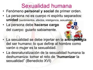 El documento proporciona pautas pedagógicas para la educación de la afectividad y la sexualidad desde una perspectiva antropológica cristiana. Aborda la situación actual, define la sexualidad humana, y ofrece recomendaciones para las etapas educativas, el ámbito escolar y familiar, destacando la importancia de la formación integral de la persona y el dominio responsable de la sexualidad.