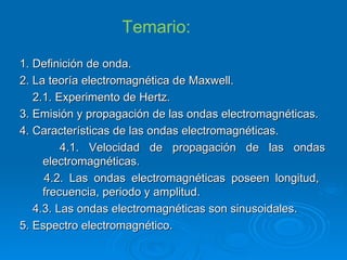 El documento resume las principales características de las ondas electromagnéticas. Explica que son ondas que se propagan a la velocidad de la luz y que fueron predichas por la teoría electromagnética de Maxwell. Describe el experimento clave de Hertz que confirmó la existencia de estas ondas y sus propiedades de longitud de onda, frecuencia y amplitud. Finalmente, resume las diferentes regiones del espectro electromagnético.
