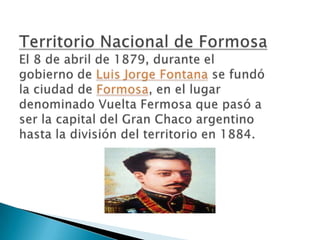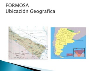 La provincia de Formosa se encuentra en el norte de Argentina y limita con las provincias de Salta y Chaco y con Paraguay. Tiene un clima cálido con temperaturas que alcanzan los 45°C en verano y una precipitación anual de 600 mm. Formosa se convirtió en provincia en 1955 aunque tuvo su primera constitución en 1957 y gobierno electo en 1958. Actualmente promueve el turismo como fuente de ingresos a través de eventos culturales y la exhibición de sus recursos naturales como el Parque Nacional Río Pilcom