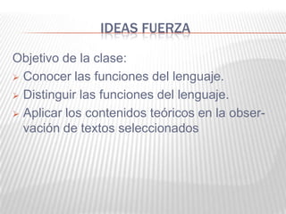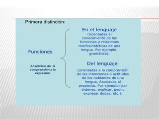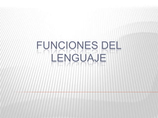 El documento describe las seis funciones principales del lenguaje: la función emotiva, la función apelativa o conativa, la función referencial, la función poética o estética, la función metalingüística y la función fática. Estas funciones representan los objetivos que se persiguen en la comunicación y incluyen expresar emociones, atraer la atención del oyente, informar, producir goce estético, hablar del propio lenguaje, y mantener conversaciones.