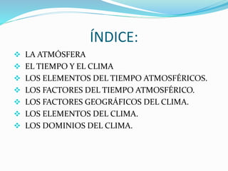 Este documento describe los elementos del tiempo atmosférico y del clima, así como los factores que los afectan. Explica que el tiempo se refiere a condiciones atmosféricas a corto plazo en un área pequeña, mientras que el clima se refiere a patrones a largo plazo en un área grande. Detalla los elementos del tiempo como la temperatura, humedad, presión atmosférica y precipitaciones. Luego describe factores como la altitud, latitud, relieve y corrientes marinas que influyen en el tiempo. Finalmente