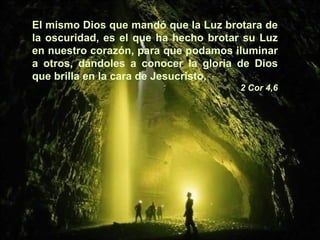 El documento habla sobre cómo Dios manifiesta su poder a través de la debilidad humana. Citando 2 Corintios 4, señala que aunque llevamos un tesoro espiritual en cuerpos débiles, Dios usa nuestras limitaciones para mostrar su fuerza. También cita 2 Corintios 12 donde Pablo dice que cuando es débil, es fuerte, porque la gracia de Dios es suficiente y se manifiesta más en la debilidad. El documento anima a confiar en el poder de Dios en las dificultades y experimentar su fuerza,