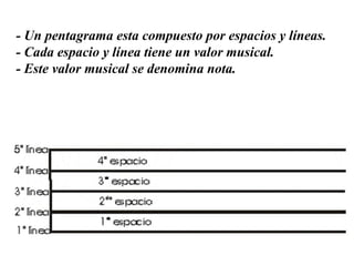 El documento describe los elementos básicos de la notación musical, incluyendo que un pentagrama está compuesto de líneas y espacios que representan valores musicales llamados notas, las claves de sol y fa que asocian las notas al pentagrama, las figuras musicales que indican la duración de las notas, la existencia de silencios correspondientes a las figuras, y el compás que divide la música en unidades de tiempo representadas por líneas verticales en el pentagrama.