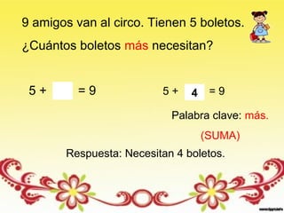Este documento presenta 4 problemas matemáticos de suma y resta sobre temas como boletos para el circo, muñecas, mesas de escuela y dulces en una fiesta. Proporciona las palabras claves para identificar si se debe usar suma o resta para resolver cada problema, así como los pasos para calcular la respuesta a cada uno.