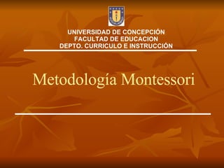 El documento describe la metodología educativa desarrollada por María Montessori. Explica que Montessori desarrolló su enfoque a partir de 1907 basado en dar libertad y apoyo al desarrollo natural del niño. Su método utiliza un ambiente preparado con materiales didácticos y da un rol activo al estudiante en su propio aprendizaje bajo la guía del maestro.