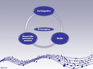 El documento describe el método educativo de Carl Orff, el cual enfatiza la participación activa de los estudiantes a través de la música, el baile y el habla. El método promueve que los estudiantes demuestren su independencia y habilidad para proponer y crear, mientras que el rol del educador es ser un colaborador. El método Orff se usa no solo para la enseñanza sino también en musicoterapia, y el documento incluye enlaces de ejemplos de actividades con niños usando instrumentos, cantando y bailando